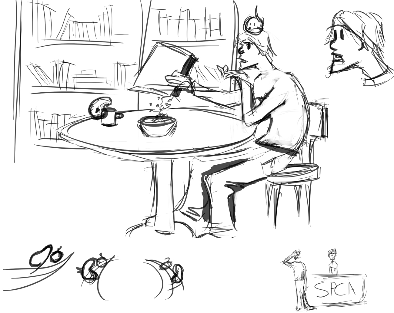 I need to start doing more detailed plans of the comics as a whole before I get too far into the art. Many of the final comics aren't composed nearly as well as they should be because I get too far along and don't feel up to changing things. At the moment I tend to just do small planing sketches like these: